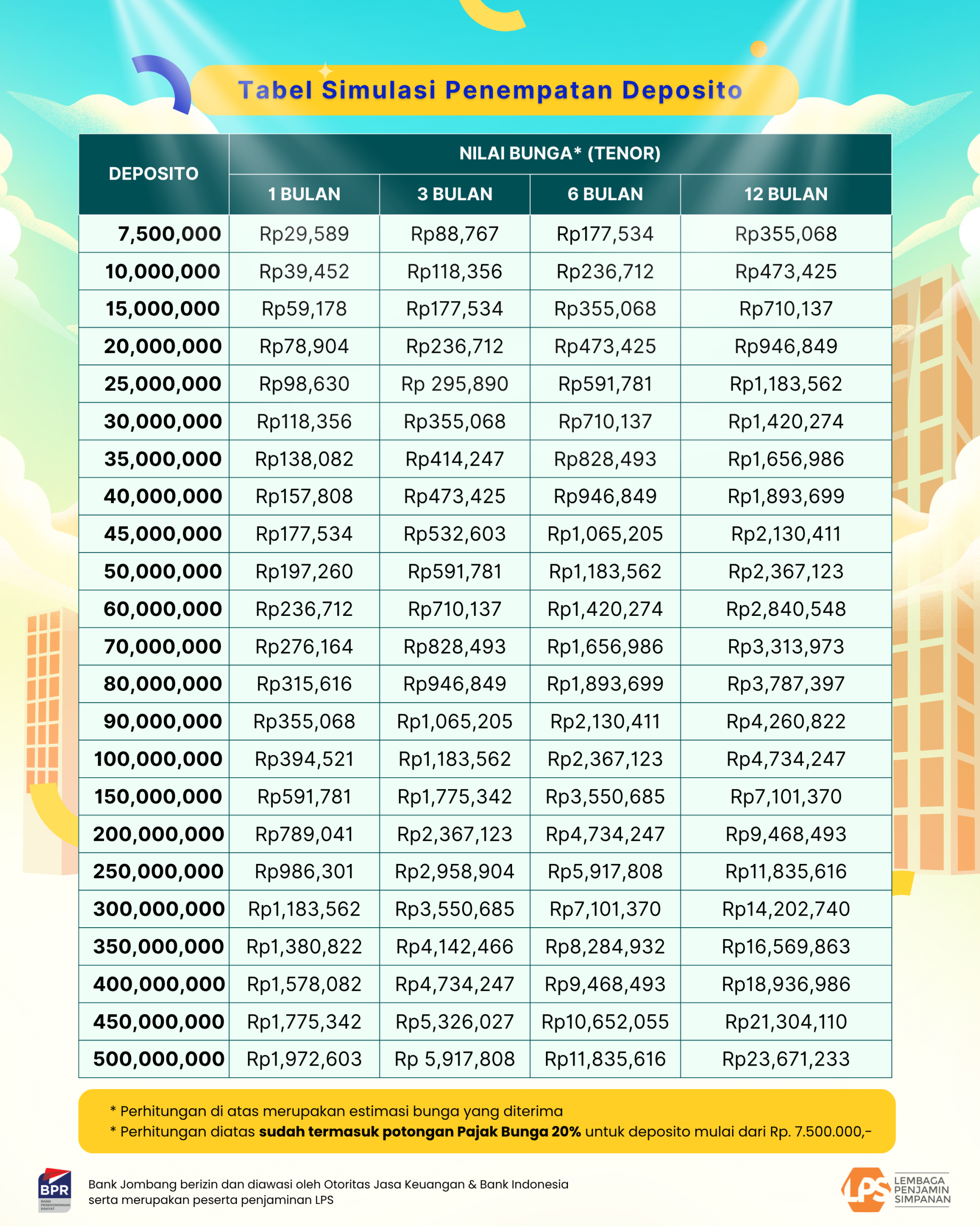 Penempatan suku bunga maksimal LPS 6,00% (update periode: 01-10-2025 s.d 31-01-2025) hanya dapat diberikan oleh nominal diatas 500 Juta/ tahun dengan minimal jangka waktu 6 (enam) Bulan. Apabila diluar ketentuan tersebut maka suku bunga yang diberikan berdasarkan list diatas.