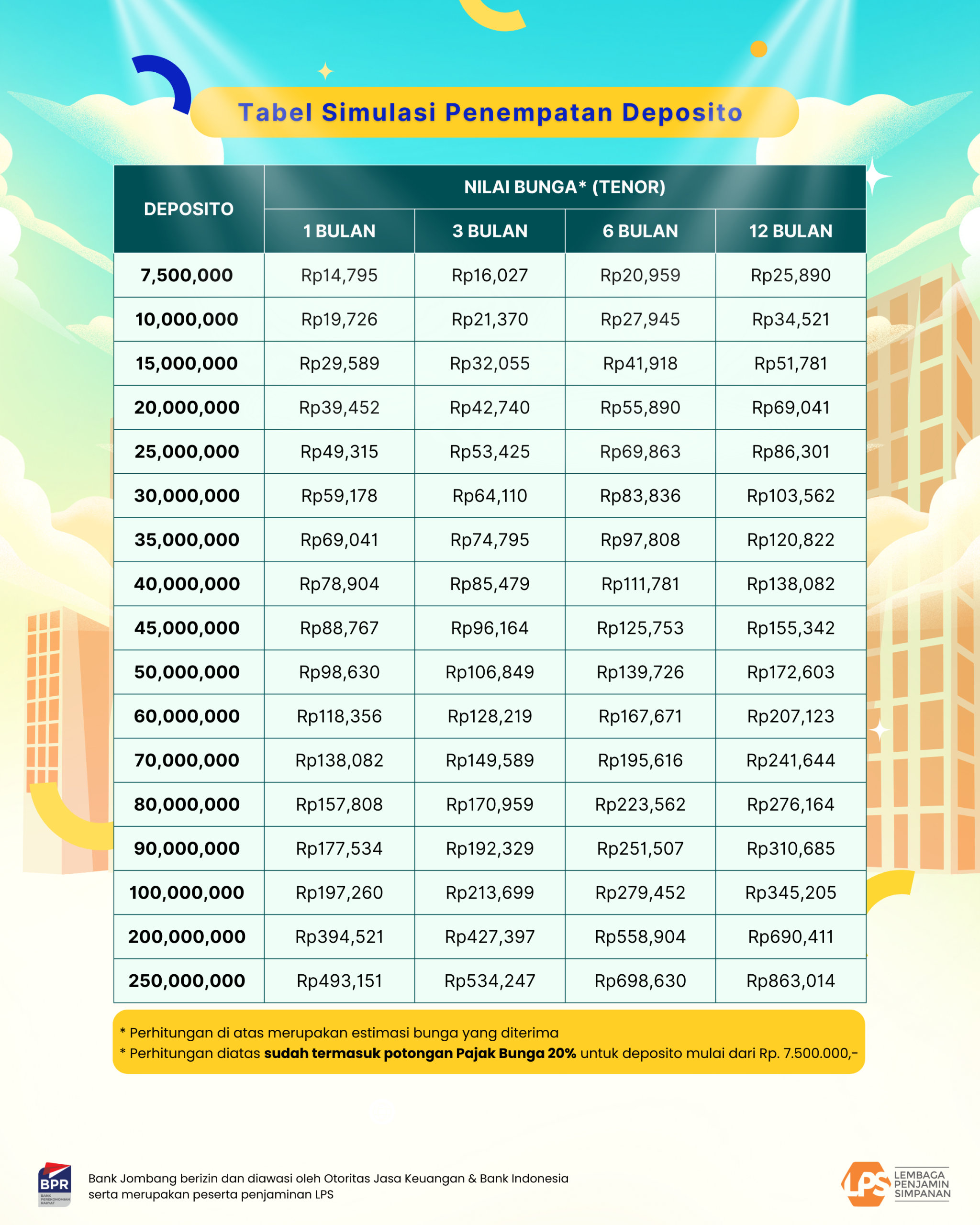 Berikut tabel penempatan deposito di Bank Jombang sesuai dengan rate LPS di BPR sebesar 6%