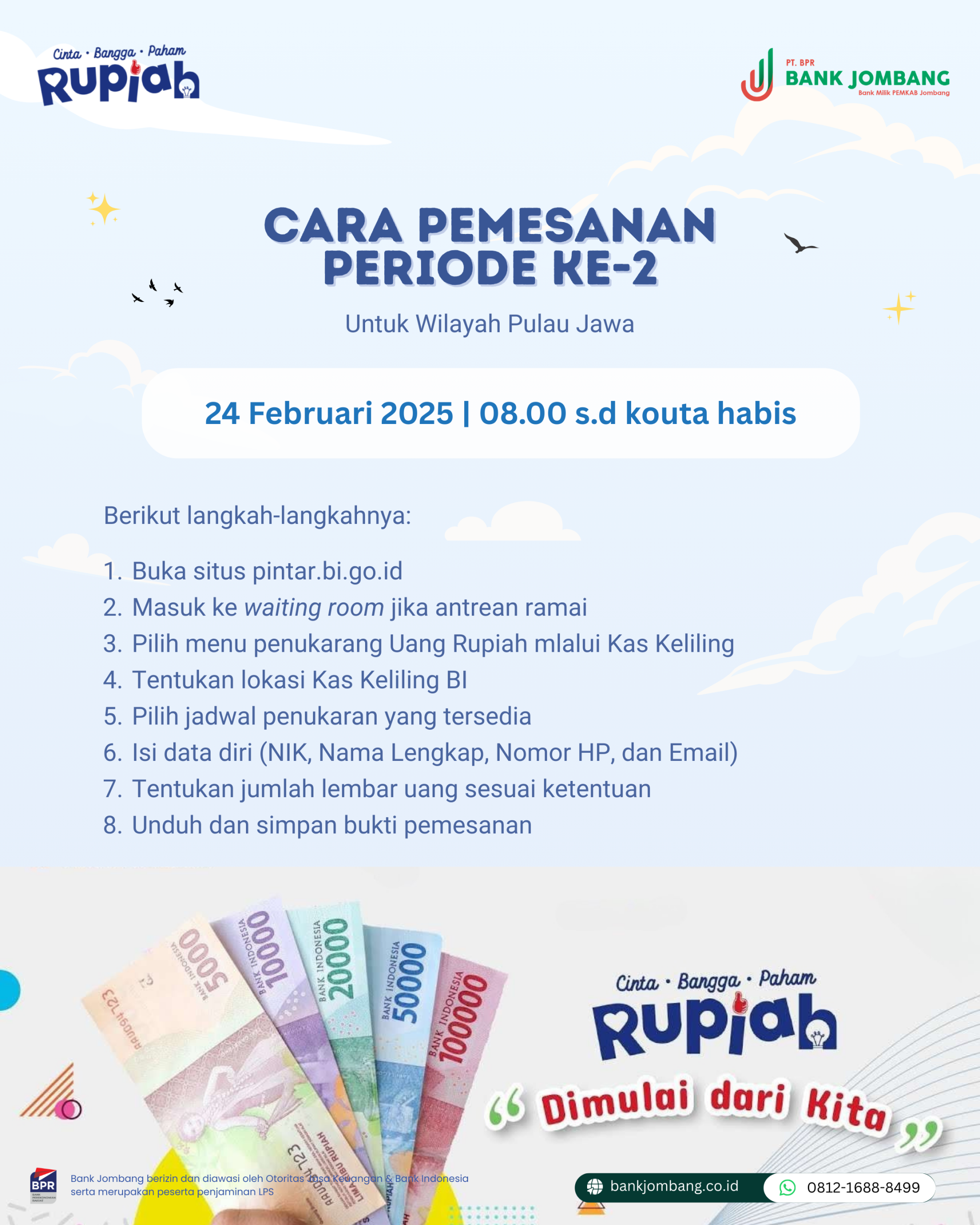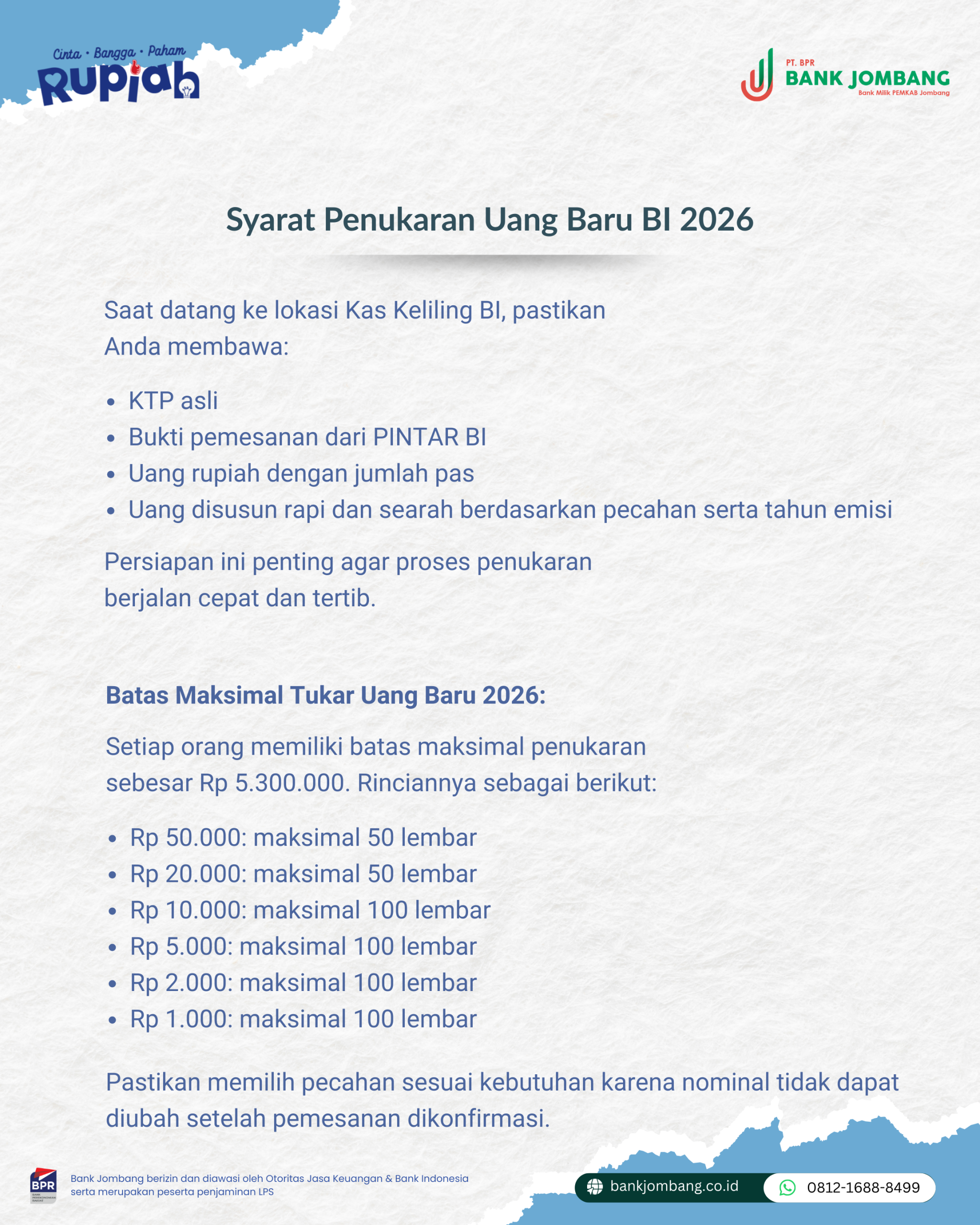 Jadwal tukar uang baru melalui aplikasi PINTAR BI wilayah Jawa dilakukan lebih cepat yaitu mulai 24 Februari 2026 hingga kuota habis. Sementara pemesanan penukaran wilayah luar Jawa dilakukan mulai 27 Februari 2026.